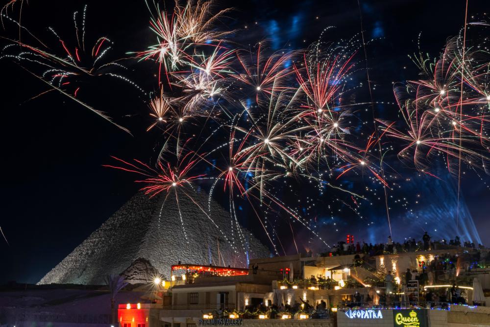 2026年1月1日凌晨,新年烟花在埃及吉萨金字塔群周边绽放。