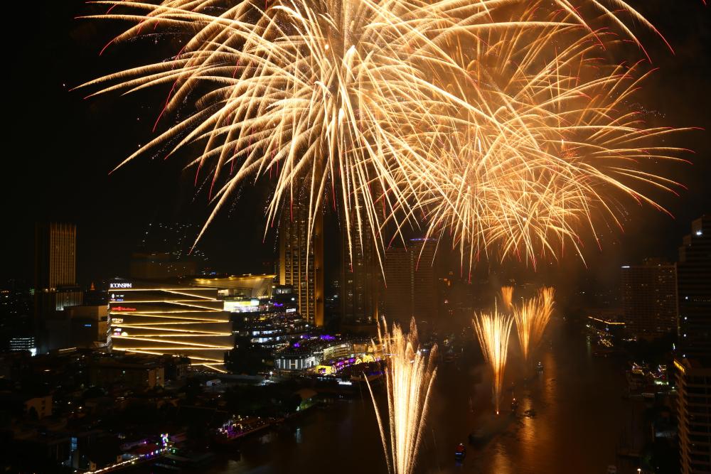 这是2026年1月1日凌晨在泰国曼谷拍摄的湄南河上的跨年烟花。