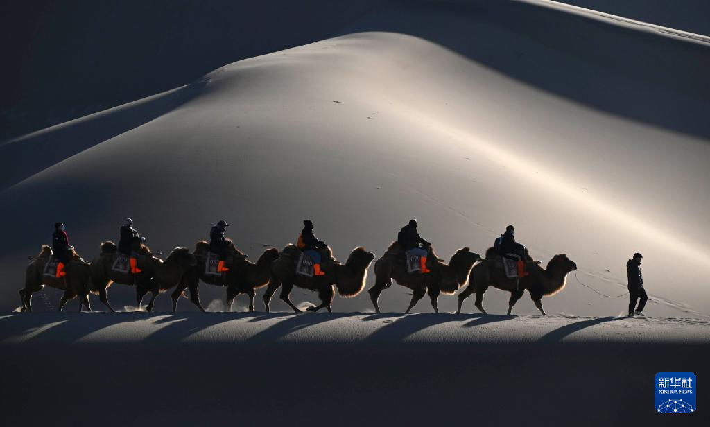 1月10日,游客在甘肃省敦煌市鸣沙山月牙泉景区游览。新华社发(张晓亮摄)