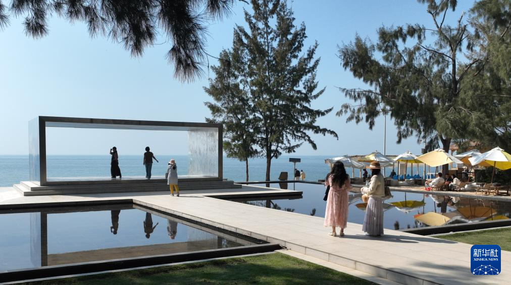 1月10日,游客在广西北海冠头岭国家森林公园海域休闲打卡(无人机照片)。新华社发(李君光摄)