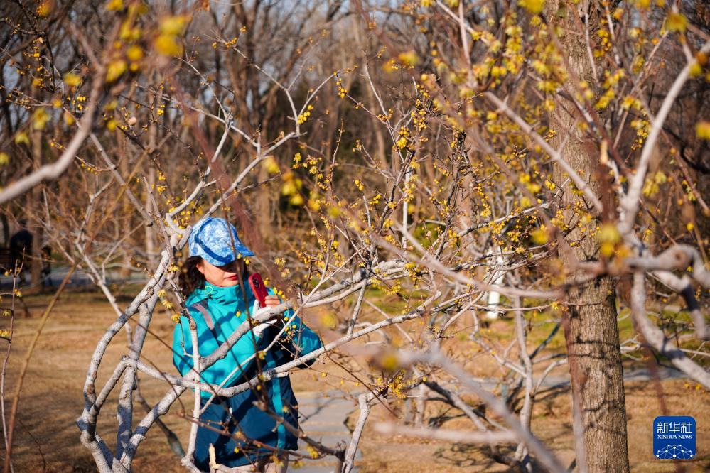1月13日,在济南市千佛山公园腊梅园,一名游客在观赏腊梅花。新华社记者 徐速绘 摄