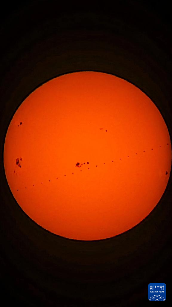 1月16日,在北京丰台花园拍摄的中国空间站飞过太阳的过程(堆栈合成照片)。新华社记者 邢广利 摄