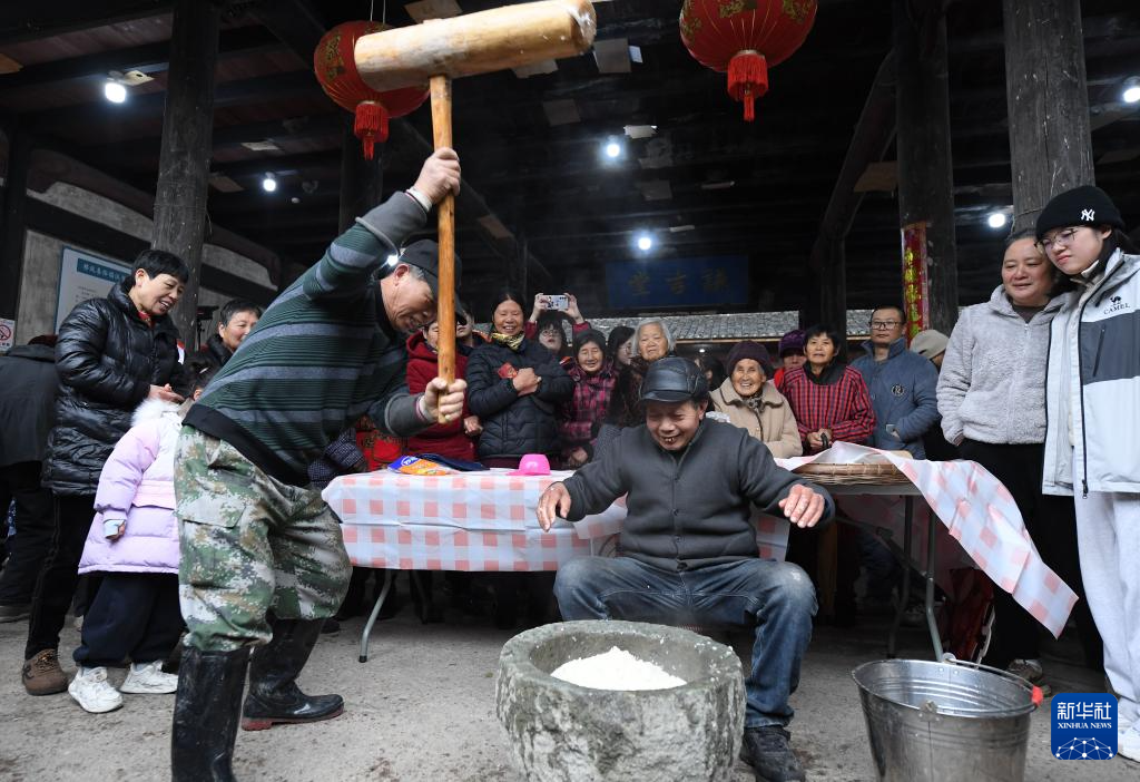 1月31日,人们在五泄镇十四都村古民居观看村民打麻糍。新华社记者 翁忻旸 摄