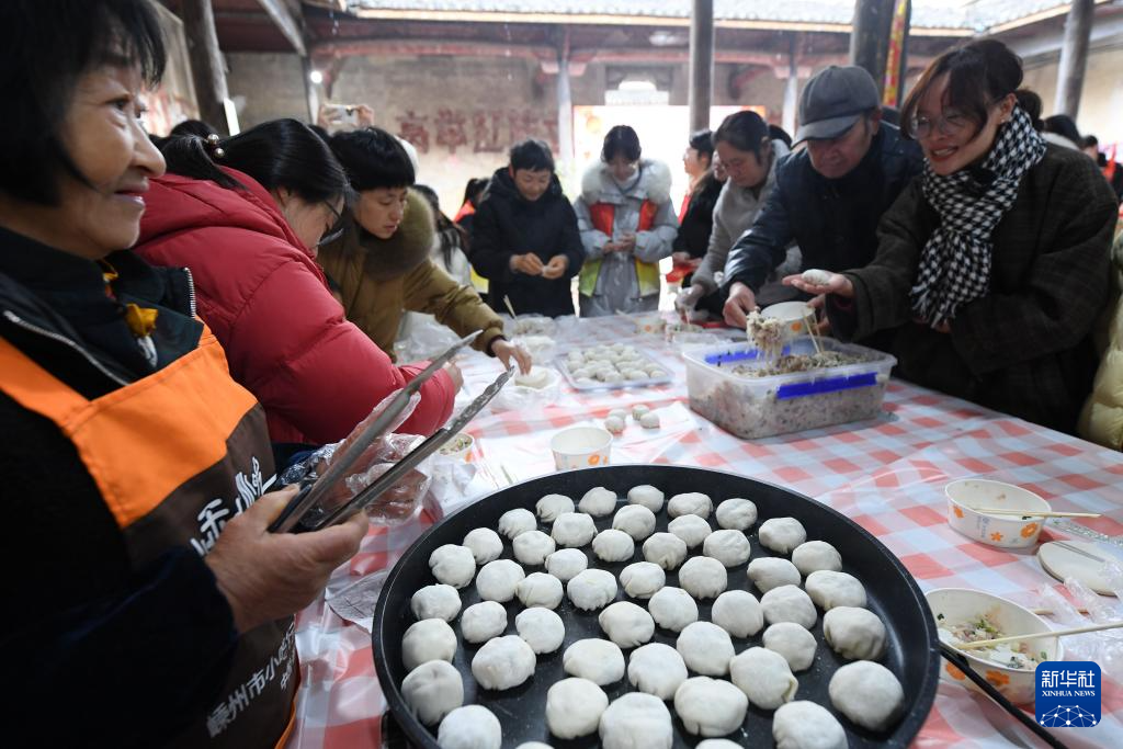 1月31日,在五泄镇十四都村古民居,人们学习制作当地特色的西施团圆饼。新华社记者 翁忻旸 摄