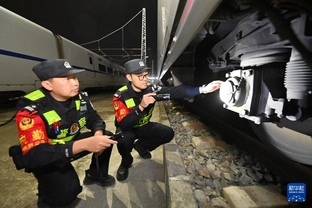 2月2日凌晨,南宁铁路公安局南宁公安处长岗岭站派出所民警在南宁动车所检查列车设备安全情况。新华社记者 陆波岸 摄