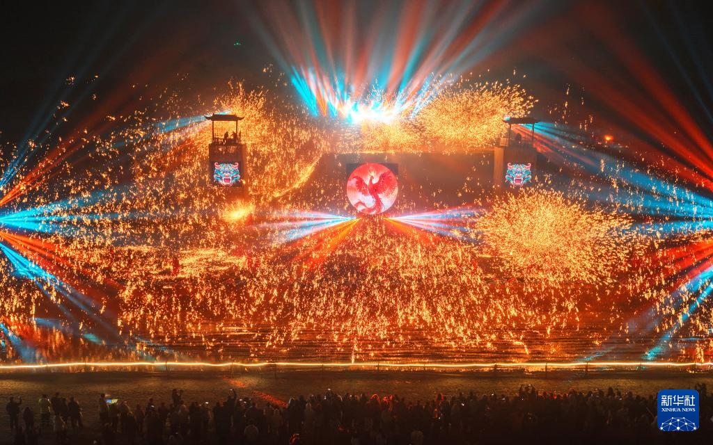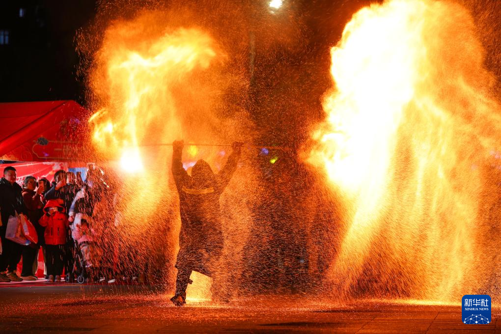 2月13日,在湖南省衡阳市南岳区1944景区,民间艺人表演打铁花。新华社发(曹正平摄)