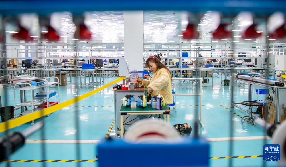 2月24日,在湖南省永州市道县高新技术产业开发区,工人在适配器生产企业流水线上工作。新华社发(蒋克青摄)