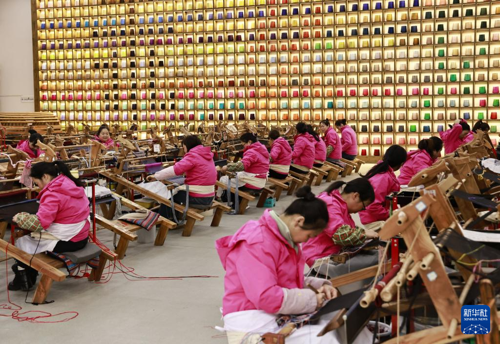 2月24日,在湖南省张家界市武陵源区乖幺妹土家族织锦生产研发基地,工人制作土家族织锦产品。新华社发(吴勇兵摄)