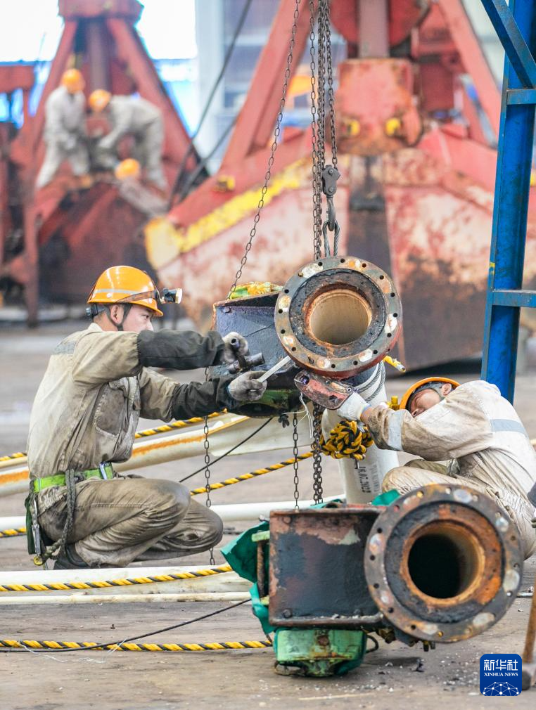 2月24日,在浙江舟山中远海运重工有限公司船舶装配现场,工人在生产作业中。新华社发(邢守秒摄)