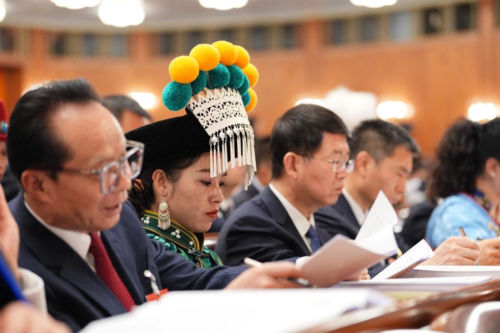 3月5日,张琼丽代表在十四届全国人大四次会议开幕会上听会。新华社记者 邢广利 摄
