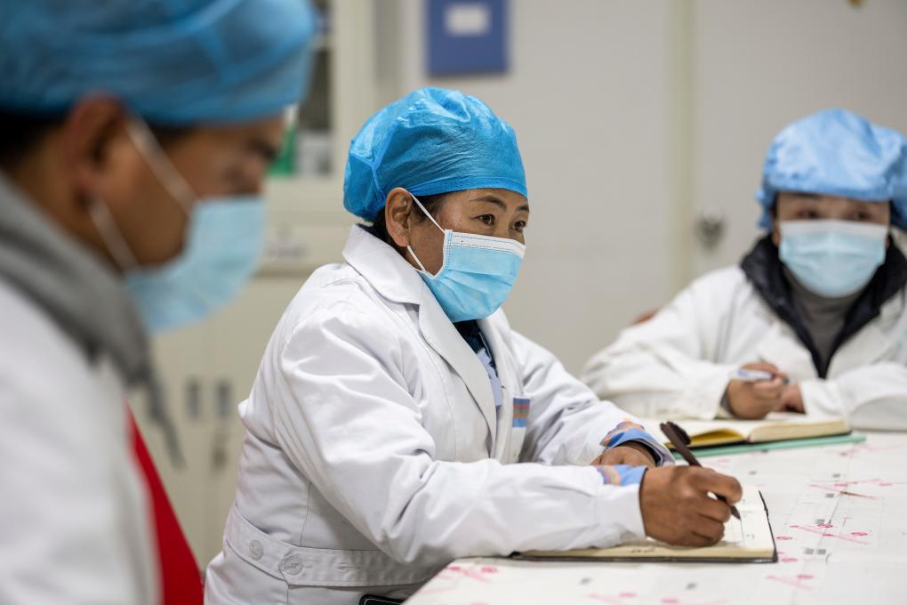 2月11日,在西藏拉萨,全国人大代表次仁措姆在西藏甘露藏医药产业集团有限公司生产车间调研。新华社记者 旦增尼玛曲珠 摄