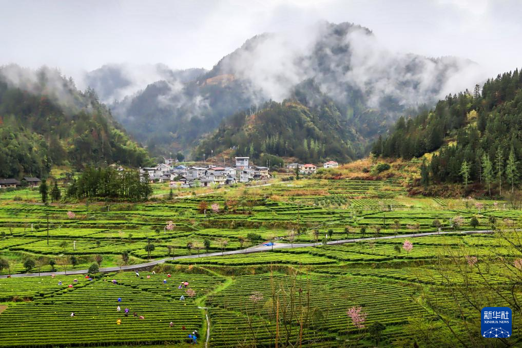 3月19日,在湖南省湘西土家族苗族自治州龙山县红岩溪镇肖家坪村,茶农在采摘春茶嫩芽。新华社发(曾祥辉 摄)