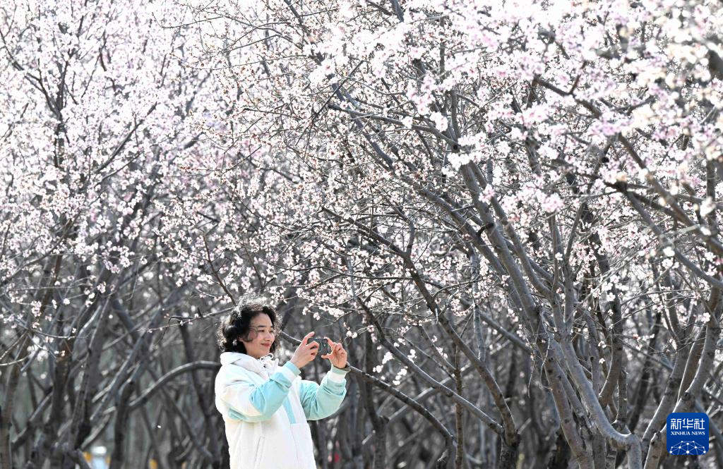 3月19日,游客在北京国家植物园赏花拍照。新华社发(刘满仓 摄)