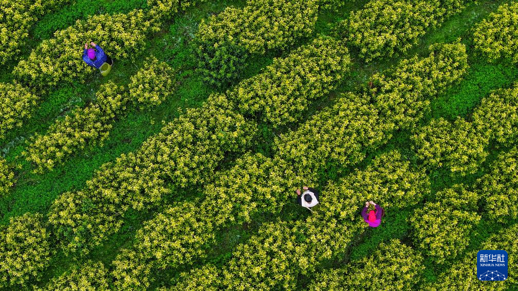 3月19日,茶农在贵州省铜仁市江口县坝盘镇挂扣村生态茶园采摘黄金芽春茶(无人机照片)。新华社发(李鹤 摄)