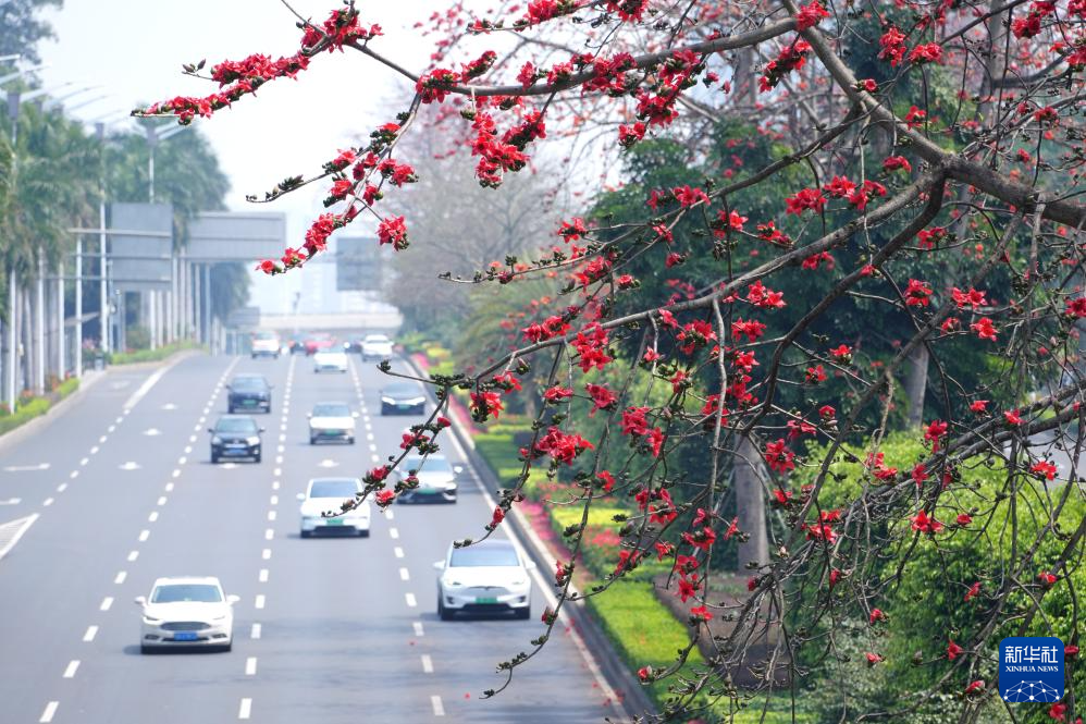 这是广西南宁市民族大道上盛放的木棉花(3月19日摄)。新华社记者 周华 摄