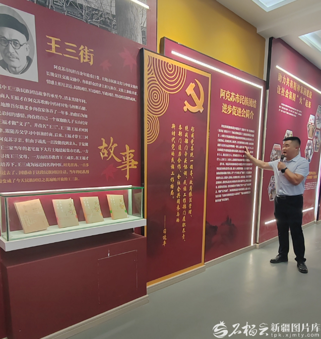 在阿克苏市民族团结进步促进会记忆馆,红桥社区工作人员在讲述王三街的故事。(资料图)