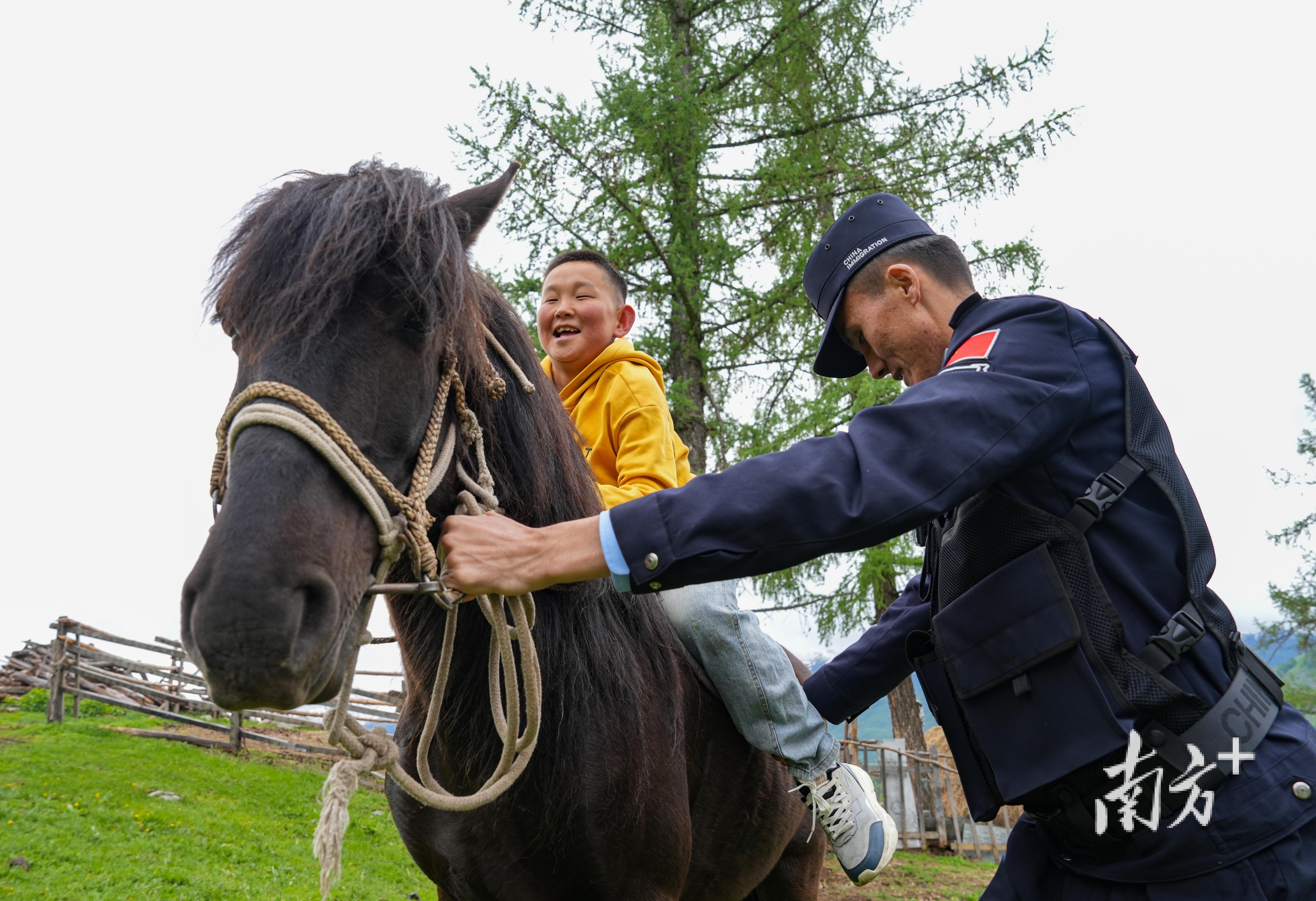 正在入户走访的民警阿依托尔·艾力帮助牧民家的孩子上马。