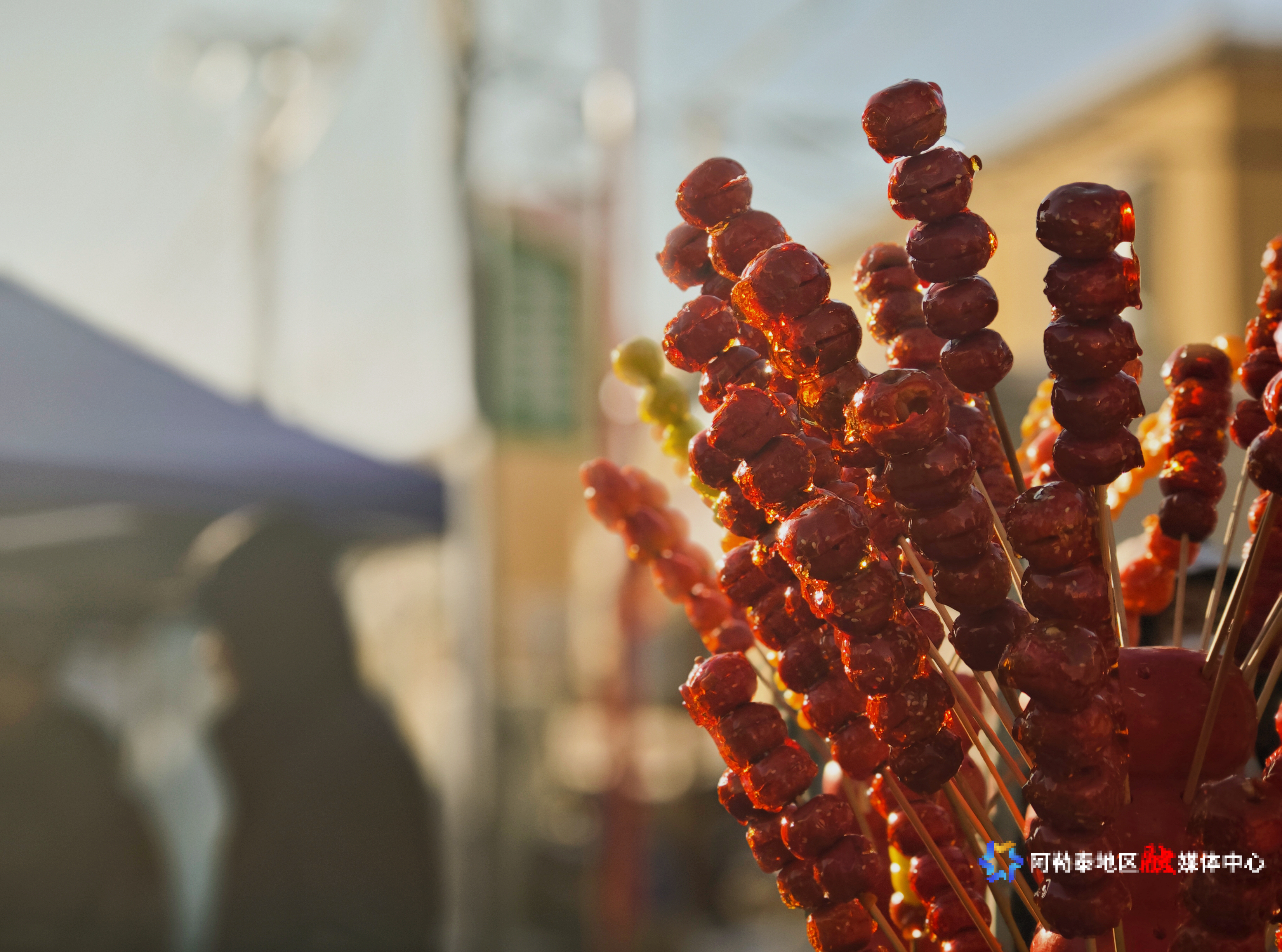 红墩大集,虽然没多么高端大气、没那么现代时尚,却承载着很多人的乡愁记忆。置身集市,处处弥漫着浓郁的人间烟火气。冒着热气的牛羊肉、晶莹剔透的糖葫芦、刚出炉的瓜子、金黄酥脆的油条……勤劳的阿勒泰人趁着赶集日,把大自然馈赠的“山珍”带到街上售卖,摊位上琳琅满目的商品与人们的欢声笑语共同构成了一幅生动的繁华景象。