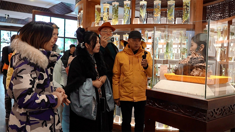 随后,一行人走进阿尔泰山中草药博物馆,开启了一场中医药文化探秘之旅。馆内陈列丰富多样,精美的中草药照片栩栩如生,蜡制植物标本形态逼真,浸制标本根须脉络清晰可见。在讲解员的引导下,媒体朋友们了解了中草药的生长环境、药用部位以及独特功效,对阿尔泰山"天然药库"的美誉有了更直观的认识,也为讲好新疆中医药文化故事积累了丰富素材。