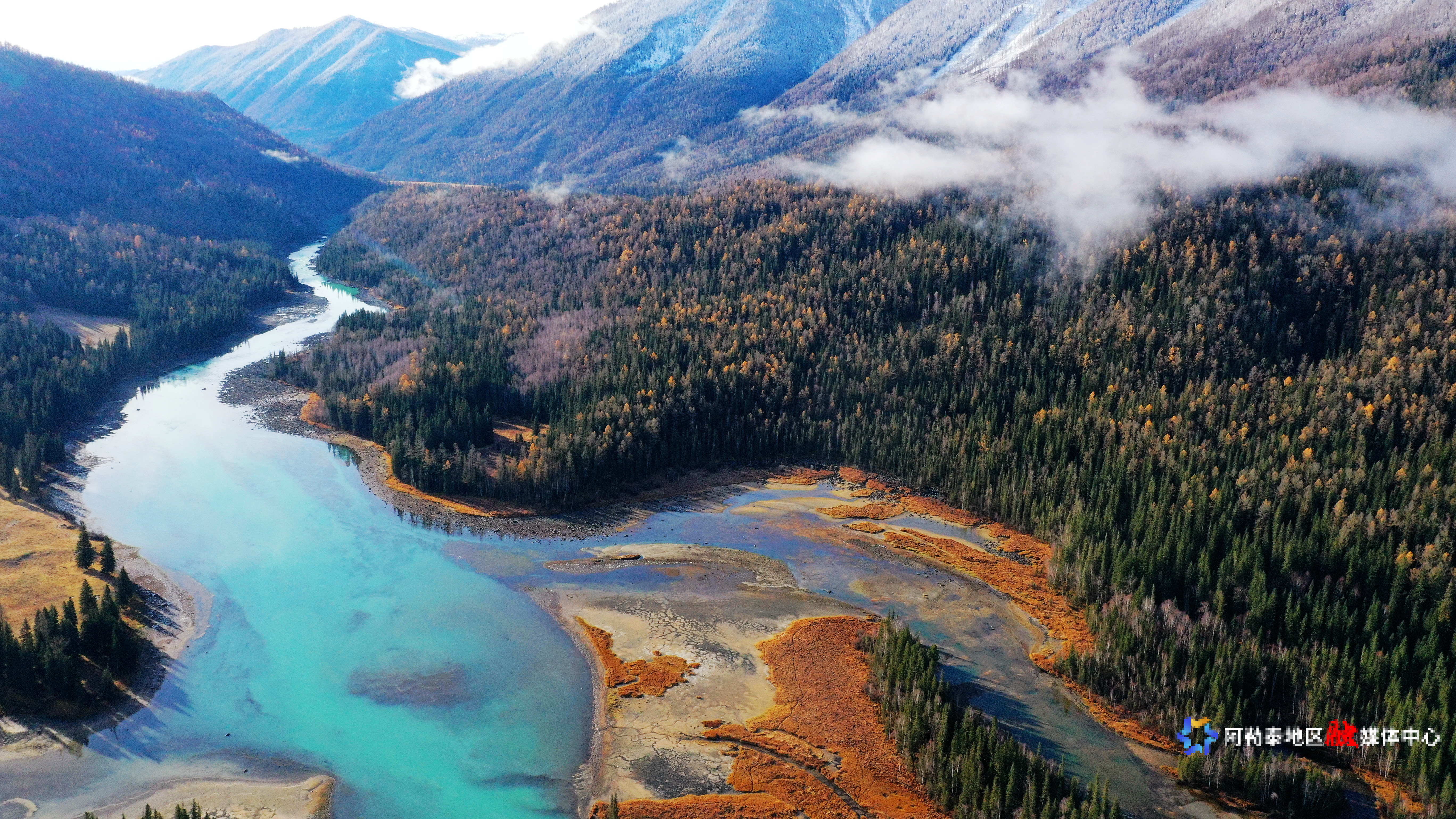 从空中俯瞰,喀纳斯河如蓝色玉带勾勒在雪山、草原和五彩缤纷的山林间。