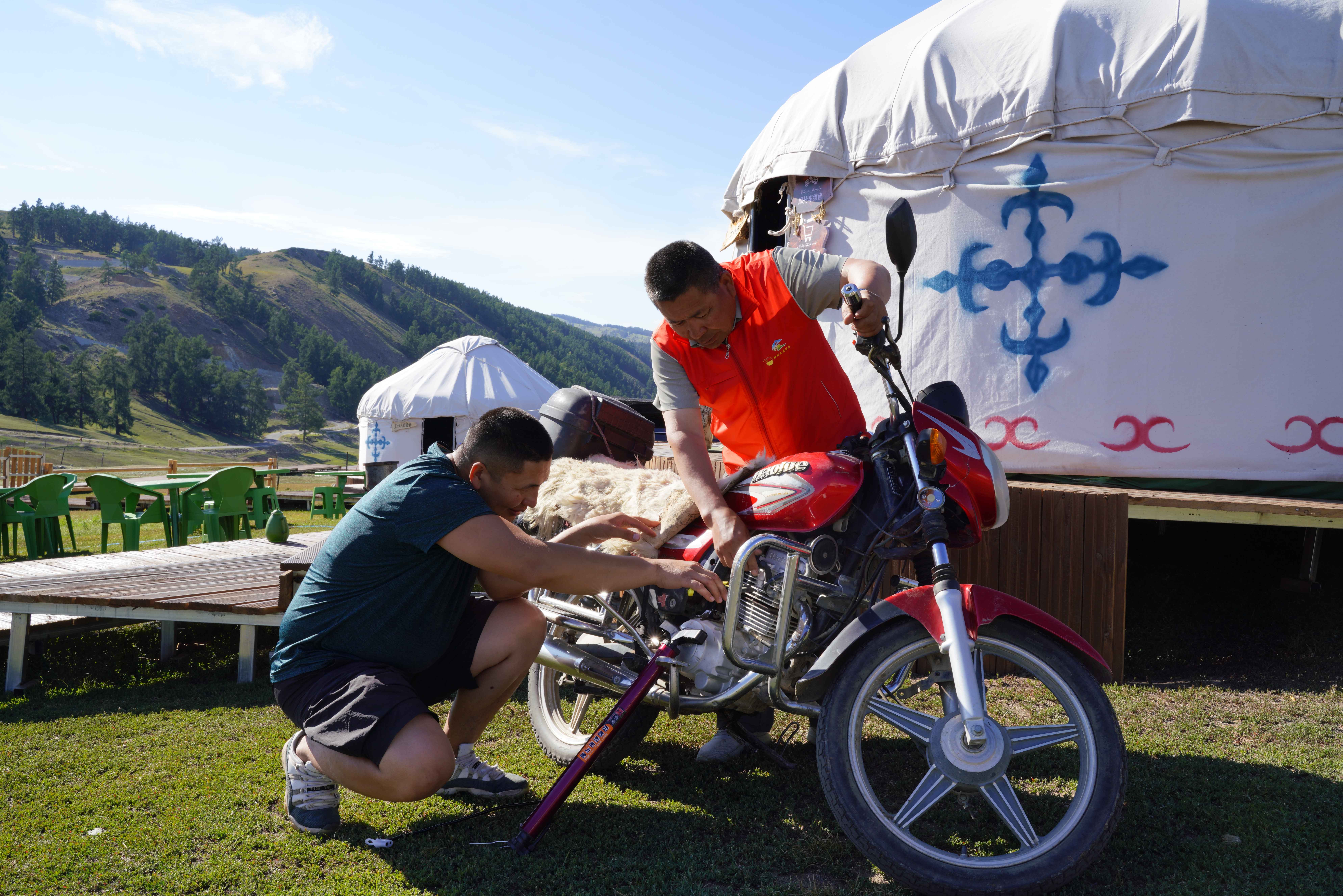 哈巴河县呼吉尔特“石榴籽服务站”的党员志愿者在为群众修摩托车。