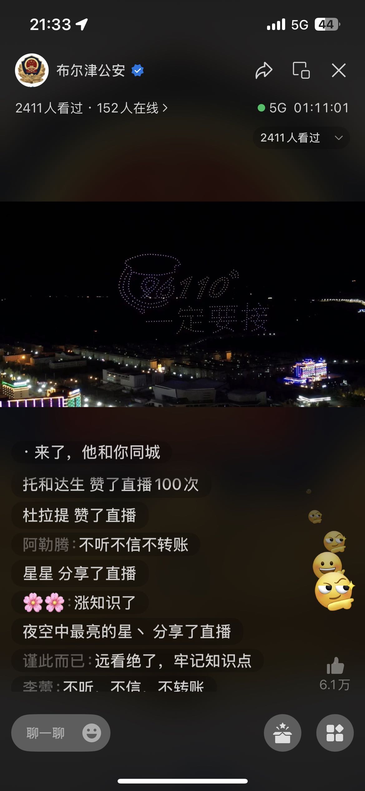 21时10分,活动首先在线上拉开帷幕。布尔津县公安局民警化身“主播”开启直播,聚焦刷单返利、冒充客服等群众容易中招的诈骗类型,结合本地真实案例剖析诈骗手法,细致讲解防范技巧。针对网友提出的各类疑问,民警逐一耐心解答,并现场演示“国家反诈中心”APP的下载、注册及预警功能使用方法,帮助屏幕前的观众直观掌握防骗“利器”。直播间互动氛围热烈,评论区提问与点赞持续刷屏。