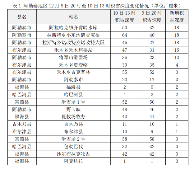 新增积雪深度前3位的站点为:阿勒泰市阿拉哈克镇齐背岭水库50厘米(新增18厘米)、阿勒泰市拉斯特乡小东沟鹊吉克桥64厘米(新增18厘米)、阿勒泰市拉斯特乡诺改特村诺改特大阪45厘米(新增18厘米)。
