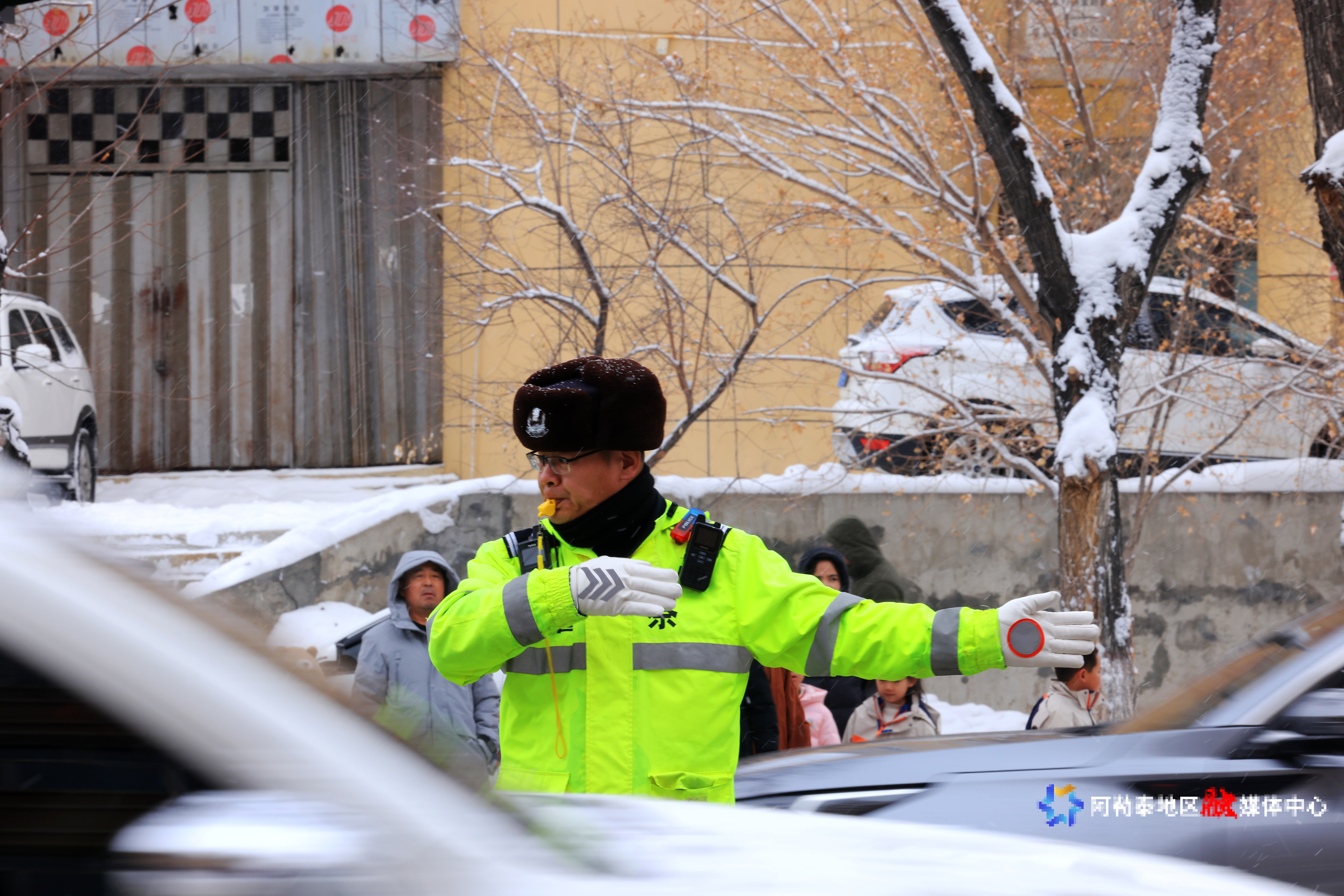 当日,阿勒泰市出现降雪天气,给学生出行带来安全隐患。为保障校园周边道路交通安全畅通,阿勒泰市公安局交通管理大队迅速启动恶劣天气应急预案,在各中小学、幼儿园门口及周边路段增设护学岗,全力守护学生出行安全。