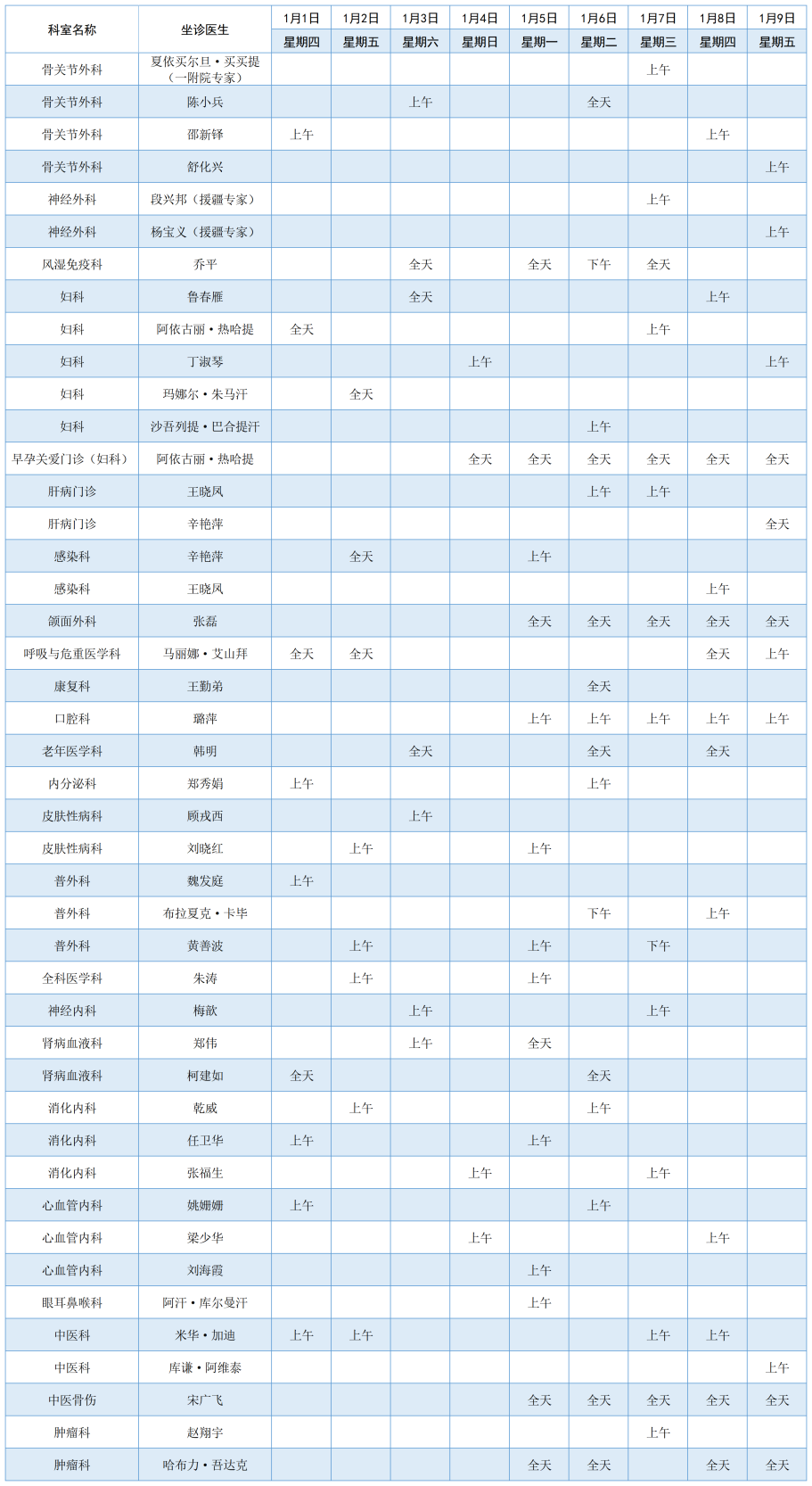 阿勒泰地区人民医院2026年1月1日至9日专家门诊出诊信息