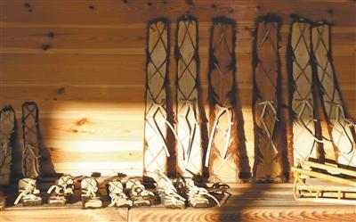 展览室里陈列的毛皮滑雪板。