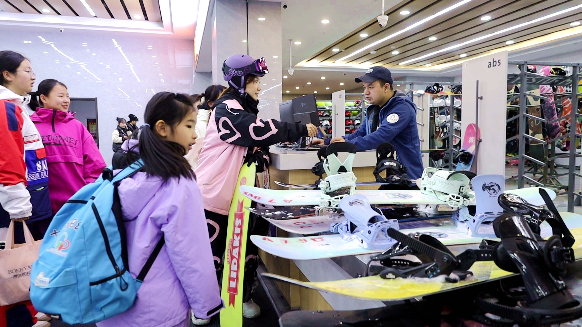 度假区雪具大厅内游客在租赁雪具。