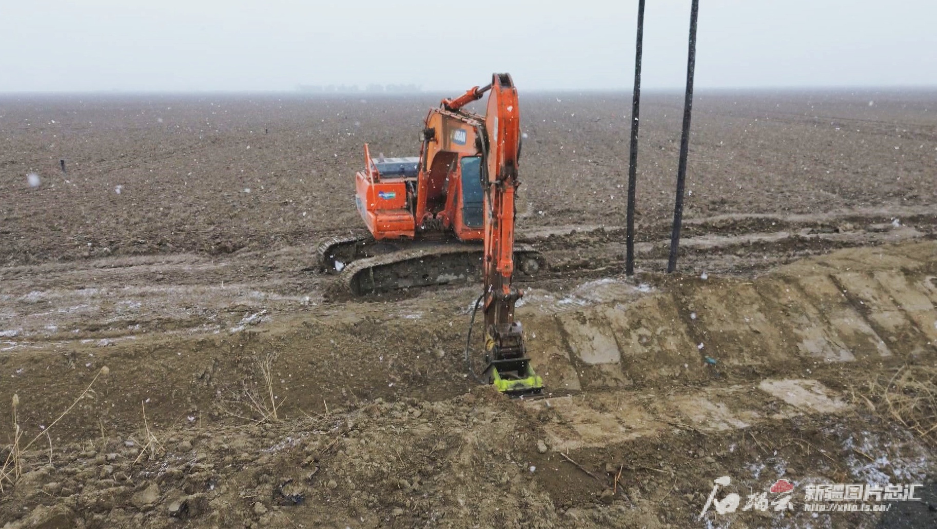 3月17日,乌苏市九间楼乡七户地村2024年高标准农田改造建设项目现场,挖掘机正在作业。图/乌苏市融媒体中心提供