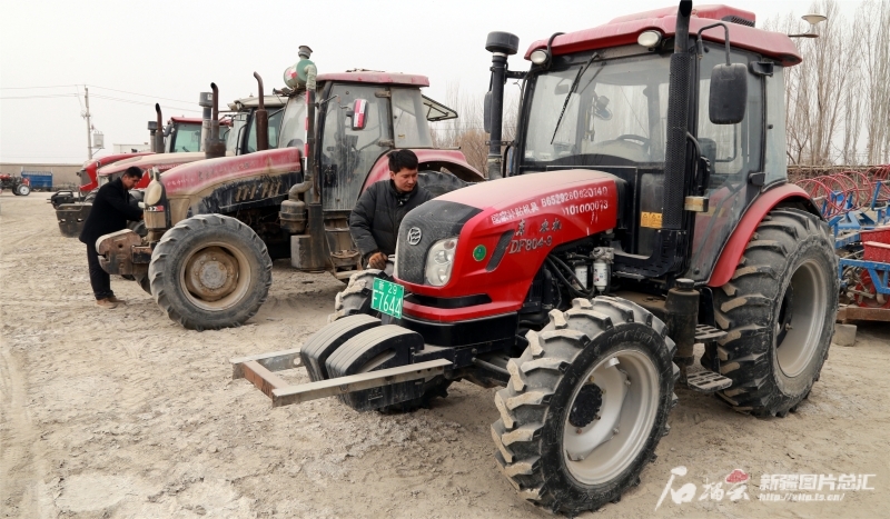 3月初,阿瓦提县阿依巴格镇农机服务人员正在检修拖拉机。包良廷摄
