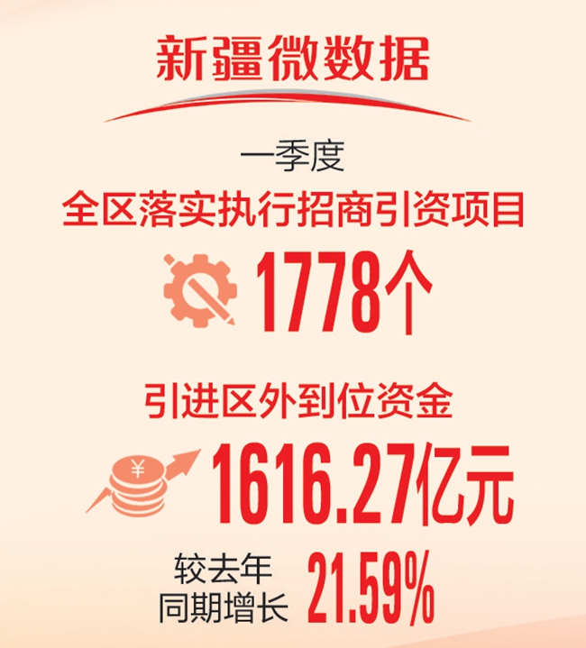 天山网-新疆日报讯(记者黑宏伟报道)记者从自治区商务厅获悉:一季度,新疆招商引资工作成效显著,全区落实执行招商引资项目1778个,引进区外到位资金1616.27亿元,较去年同期增长21.59%。