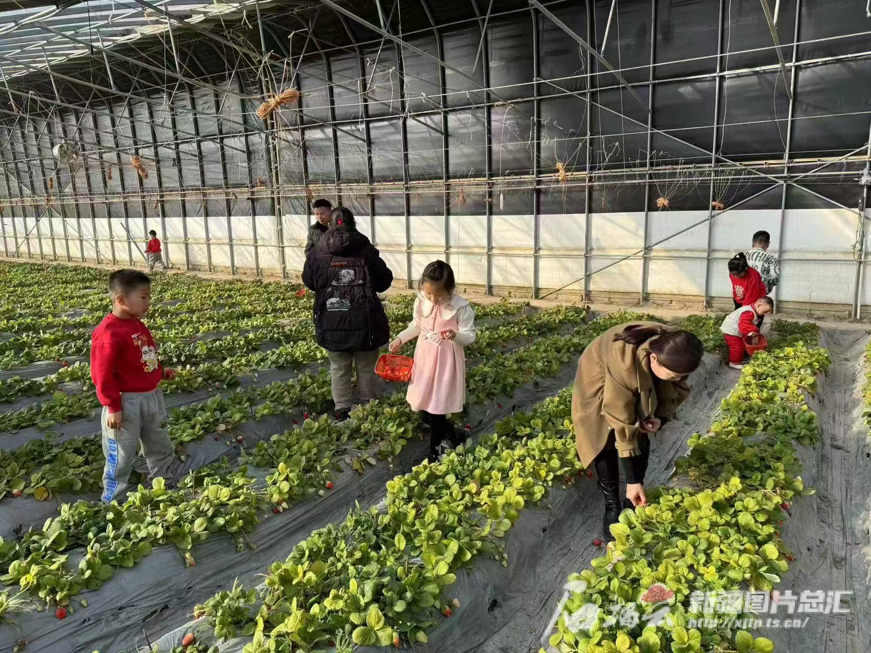 4月6日,在沙雅县雁栖田园生态文化旅游景区设施农业基地,一些家长带着孩子采摘草莓。王永江 摄