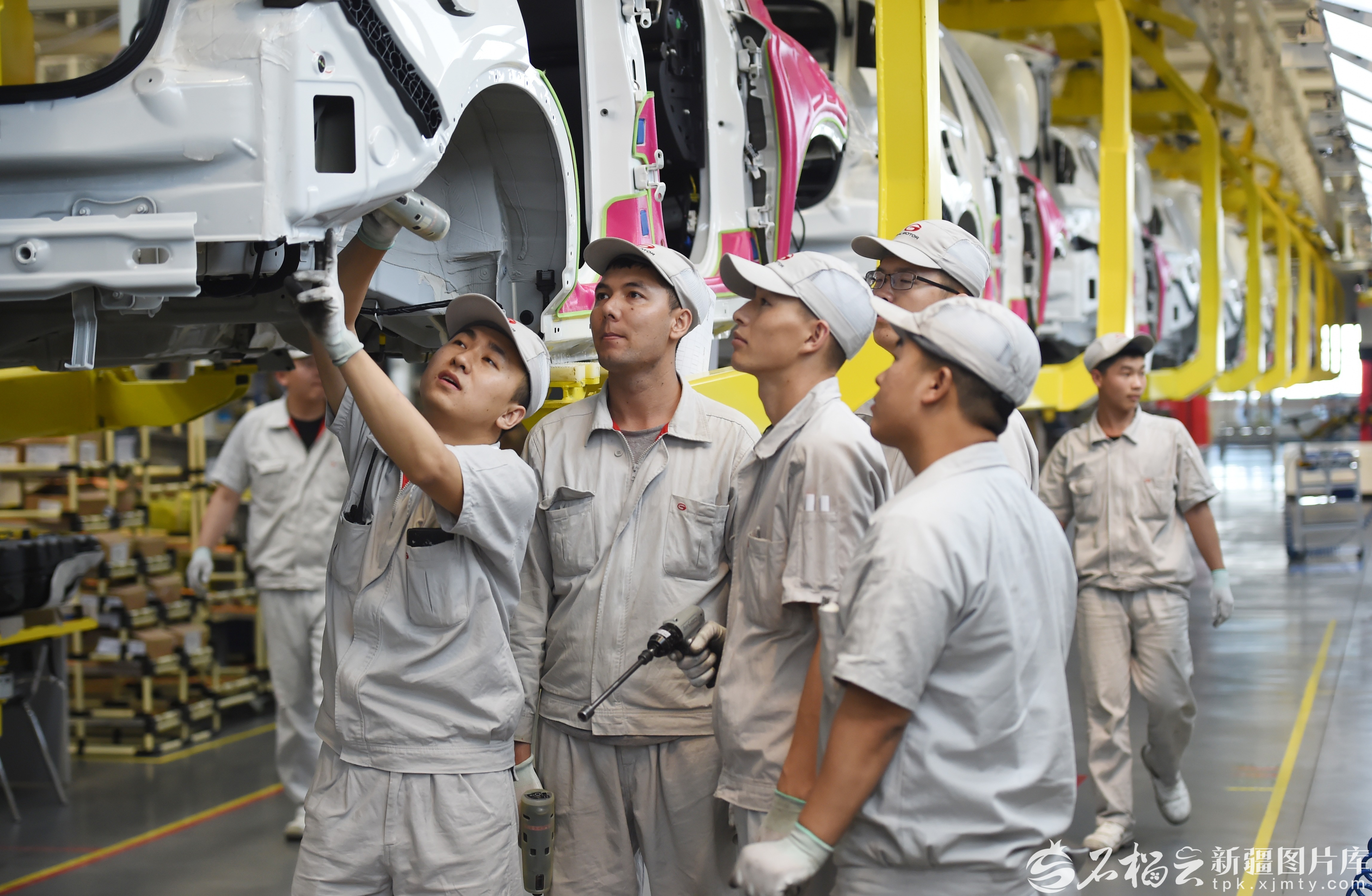 广汽乘用车有限公司新疆分公司技术人员指导新员工在汽车生产线上学习(2019年7月10日摄)。 天山网-新疆日报记者汤永摄