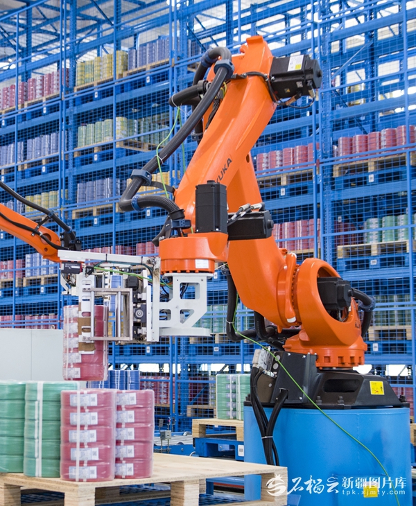 3月5日,位于昌吉国家高新技术产业开发区的特变电工智能电缆产业园内,智能码垛机器在数字化布电线车间作业。何龙摄