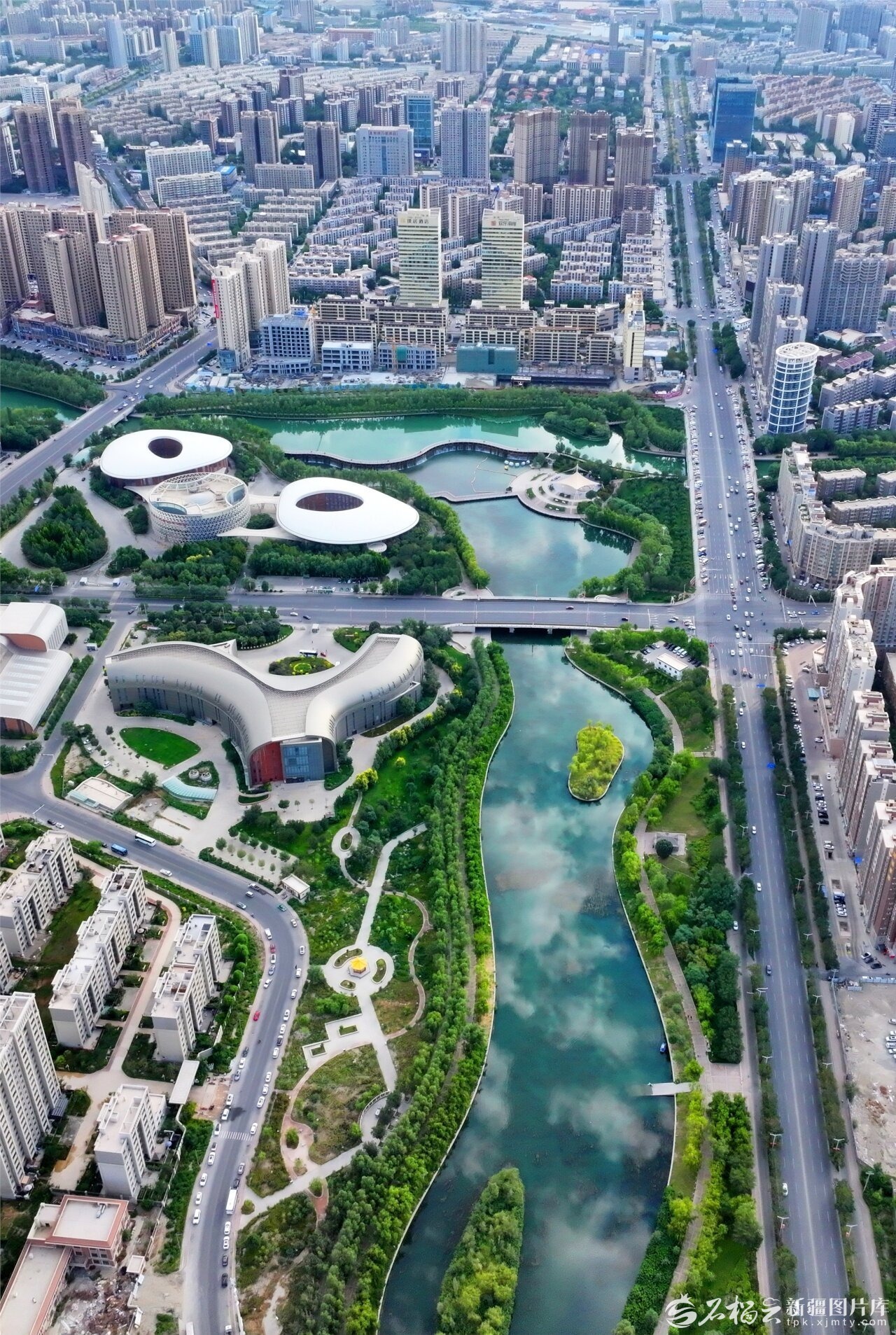 库尔勒市天鹅河和鸿雁河交界处景色旖旎(8月11日无人机摄)。近年来,库尔勒市依托人工河加大城市绿化工作力度,形成一个完整的城市绿地生态系统。确·胡热摄