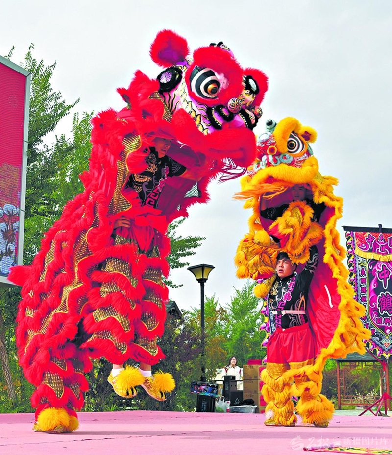 9月23日,为庆祝自治区成立70周年、欢庆“中国农民丰收节”,和布克赛尔蒙古自治县查和特乡举行了一系列活动。图为群众进行舞狮表演。何承强摄