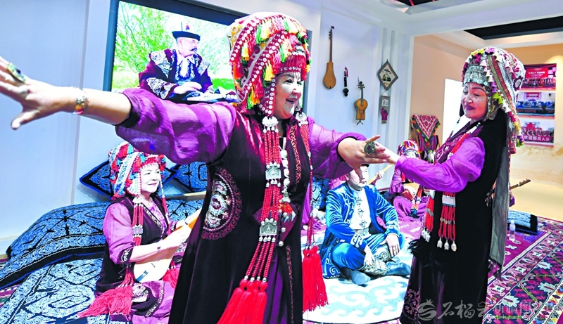 近日,在庆祝新疆维吾尔自治区成立70周年——克孜勒苏柯尔克孜自治州主题成就展展厅内,阿图什市民间艺人深情吟唱英雄史诗《玛纳斯》。图为民间艺人在吟唱中起舞。天山网-新疆日报记者汤永摄