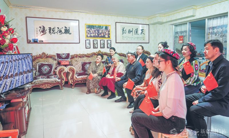 9月25日,沙勒克江·依明(左四)和邻居一起收看新疆维吾尔自治区成立70周年庆祝大会现场直播。素德别力克摄