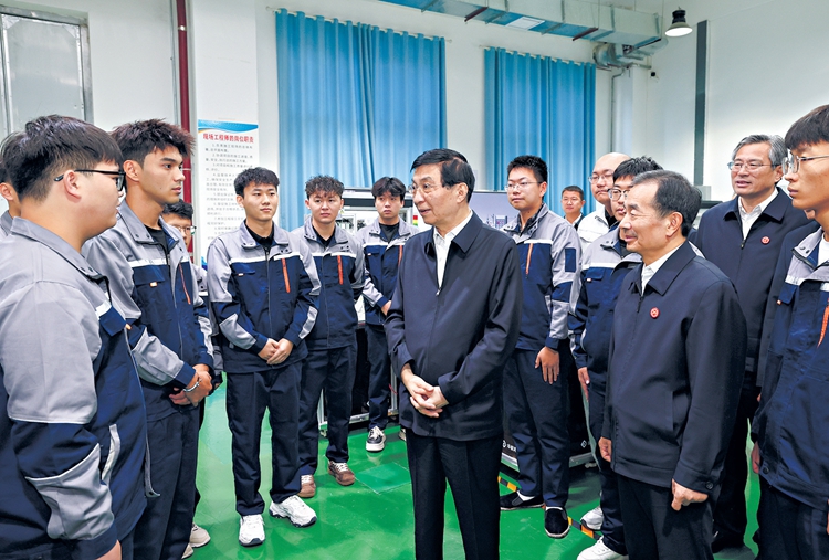 9月26日,受习近平总书记嘱托,中共中央政治局常委、全国政协主席、中央代表团团长王沪宁带领中央代表团部分成员到新疆生产建设兵团第二师铁门关市、第十师北屯市考察。这是王沪宁和中央代表团部分成员在兵团兴新职业技术学院考察职业教育发展情况。新华社记者姚大伟摄