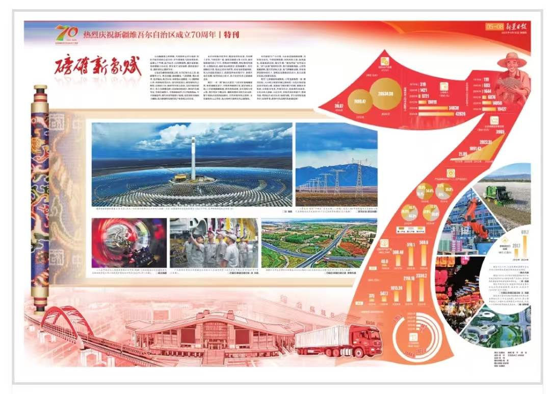 在庆祝新疆维吾尔自治区成立70周年的历史性节点,9月17日至9月23日,新疆日报重磅推出《方略领航赋》《磅礴新象赋》《绿水青山赋》《奔腾之路赋》《和风共沐赋》《同心筑梦赋》和《情暖天山赋》系列特刊,用汉赋雅韵这一承载千年的文学表达,郑重致敬自治区70年的发展成就。