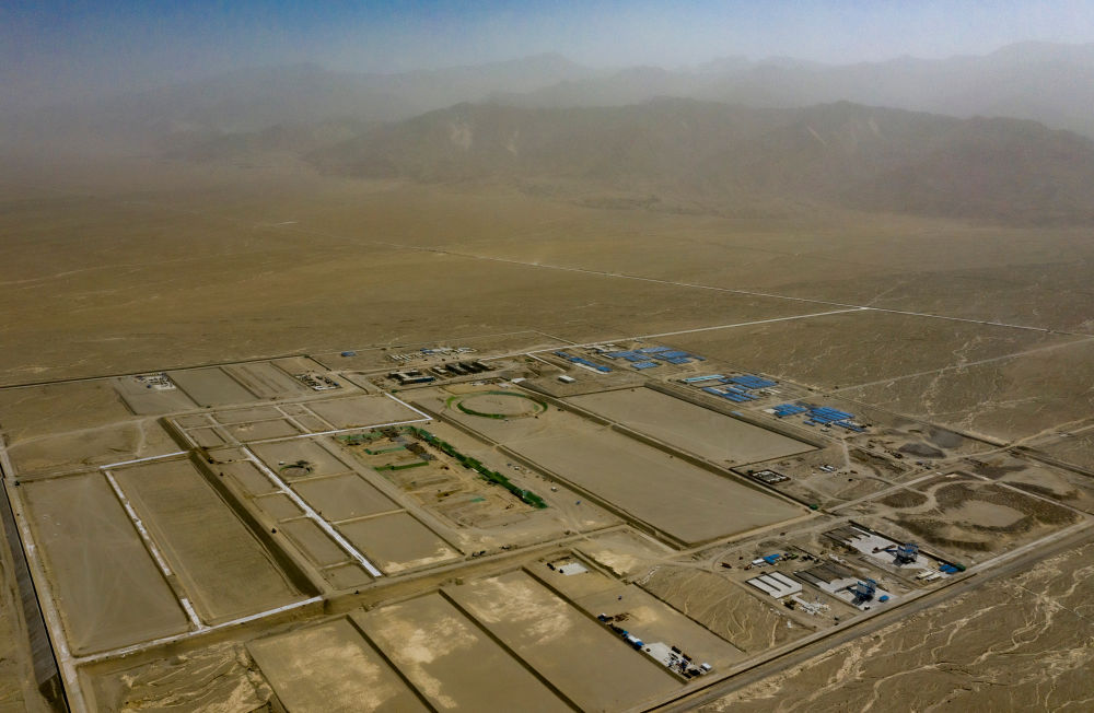9月22日在新疆巴音郭楞蒙古自治州若羌县拍摄的中国绿发新疆中绿电若羌400万千瓦光伏项目(无人机照片)。该项目每年可发电69.08亿千瓦时,满足南疆200万户家庭用电需求,减排208.24万吨煤耗。