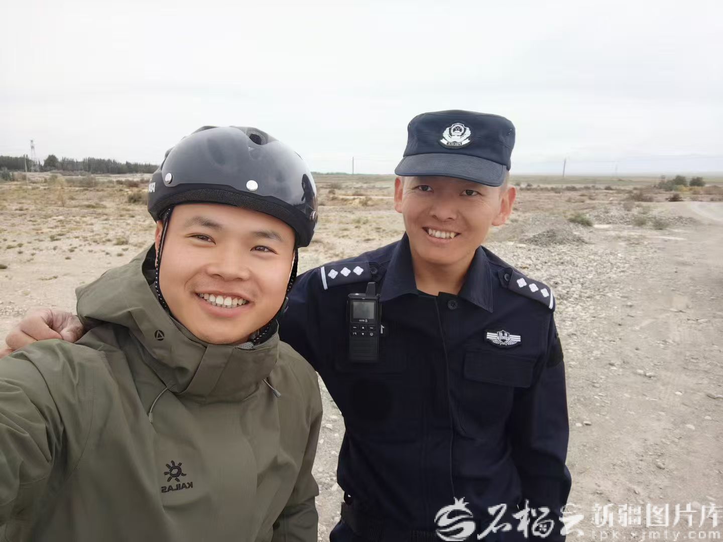 10月5日,内蒙古游客苏先生与乌恰县公安局波斯坦铁列克乡派出所所长李雪宏合影留念。图为苏先生自拍
