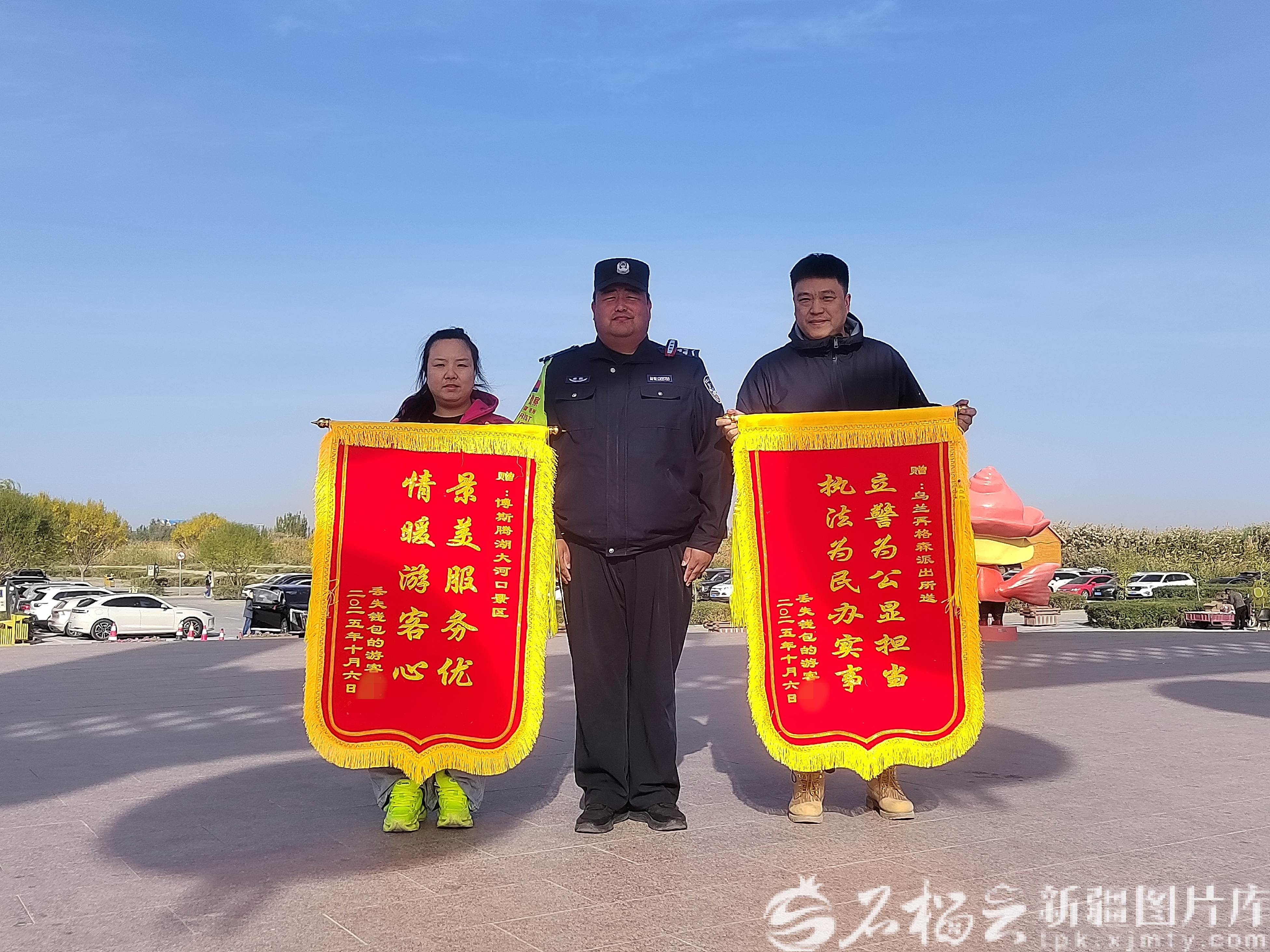10月6日,游客向博湖县公安局乌兰再格森镇派出所民警送上锦旗表示感谢。 张景凤摄