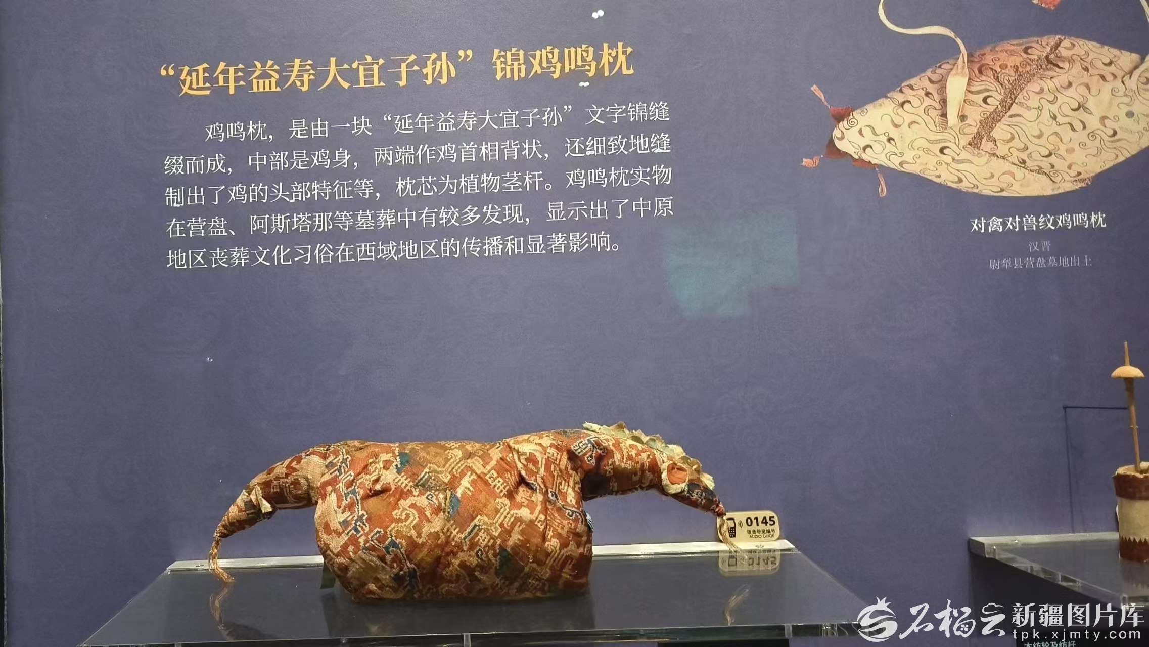 出土于尼雅遗址的“延年益寿大宜子孙文字锦鸡鸣枕”,由一块“延年益寿大宜子孙”文字锦缝缀而成,中间是鸡身,两端作鸡首相背状,白绢为底,用叠放三层圆形红绢片缝制出圆眼,天青和白色两种绢剪出锯齿形的鸡冠,枕芯是植物茎秆。在缝制这件鸡鸣枕的织锦面料上,除了织有“延年益寿大宜子孙”的汉字外,还织有花卉、祥云等图案。这件织锦不仅是丝绸之路上物质交流的见证,更是中原与西域文化在经纬交织中实现精神共鸣的象征。