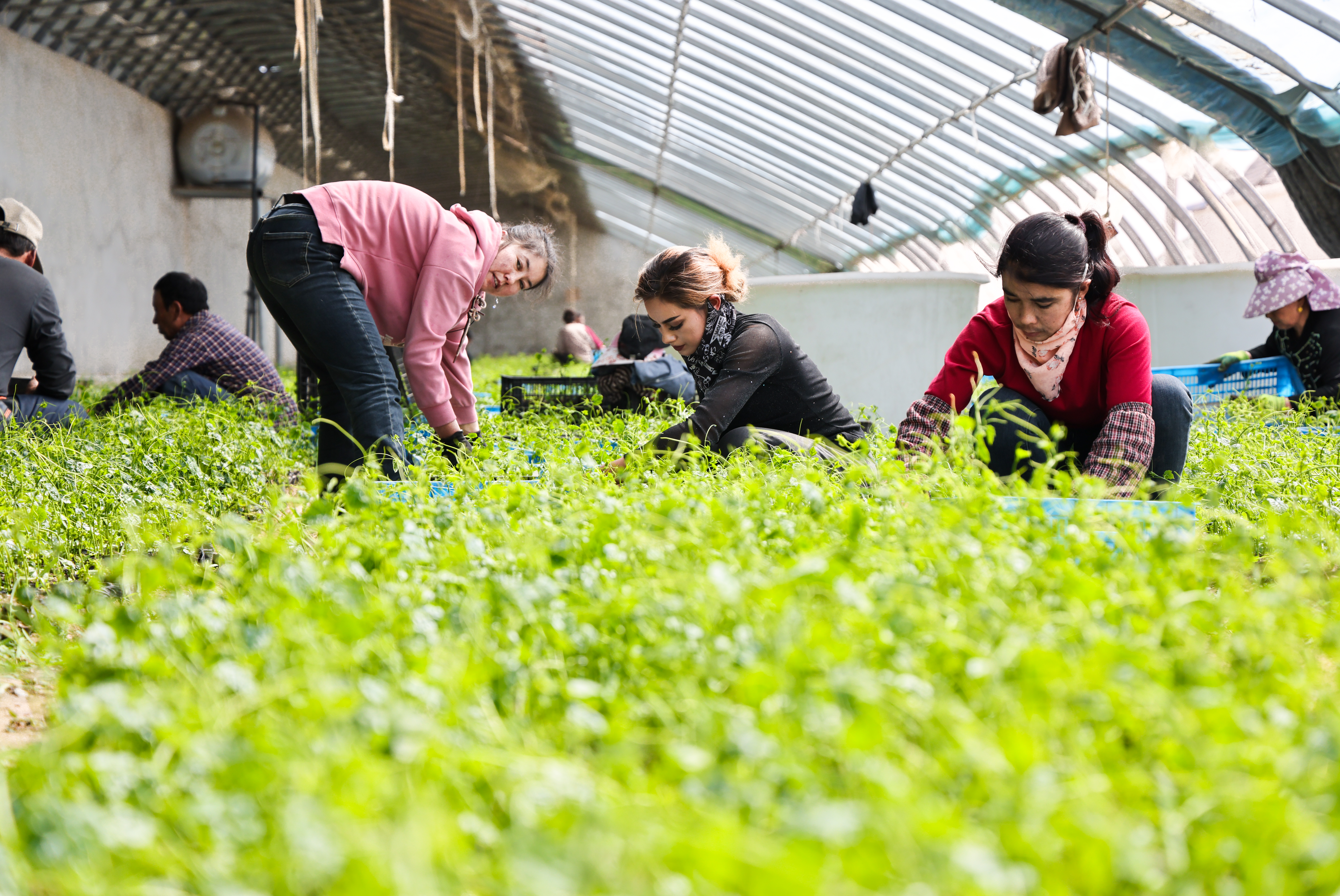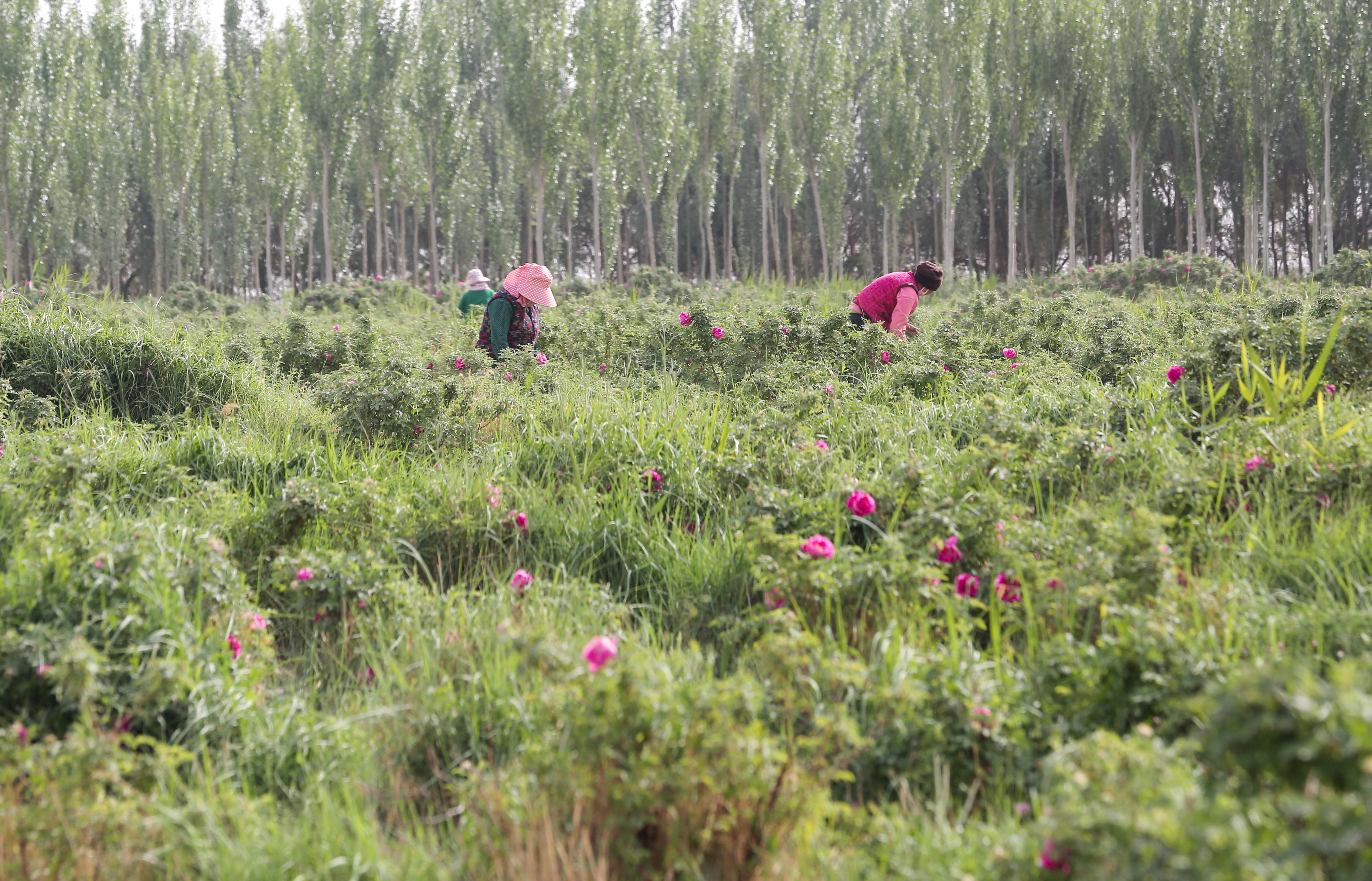 花农在于田县奥依托格拉克乡的瑰觅特色玫瑰种植基地采摘玫瑰花。许晓龙 摄