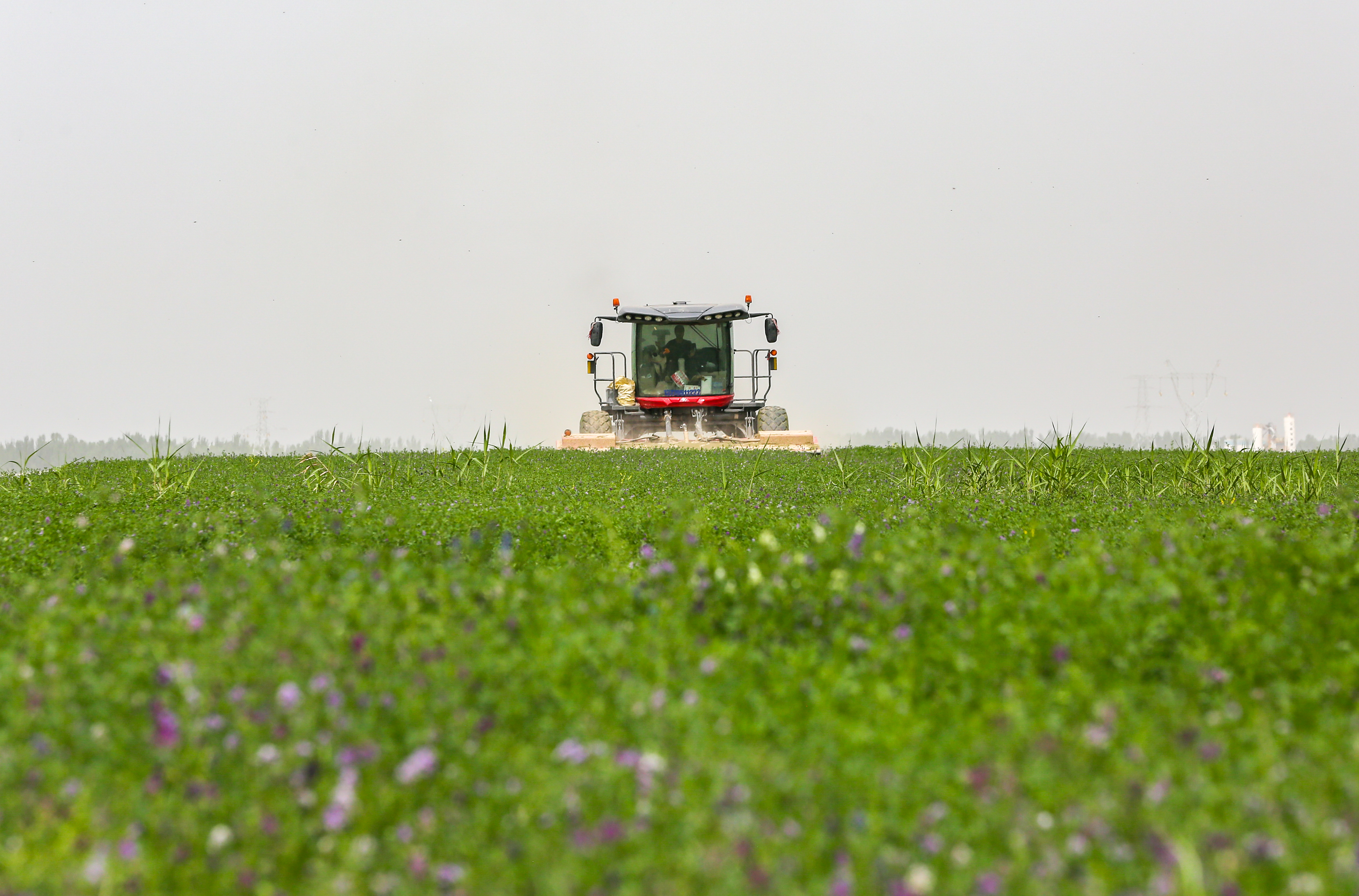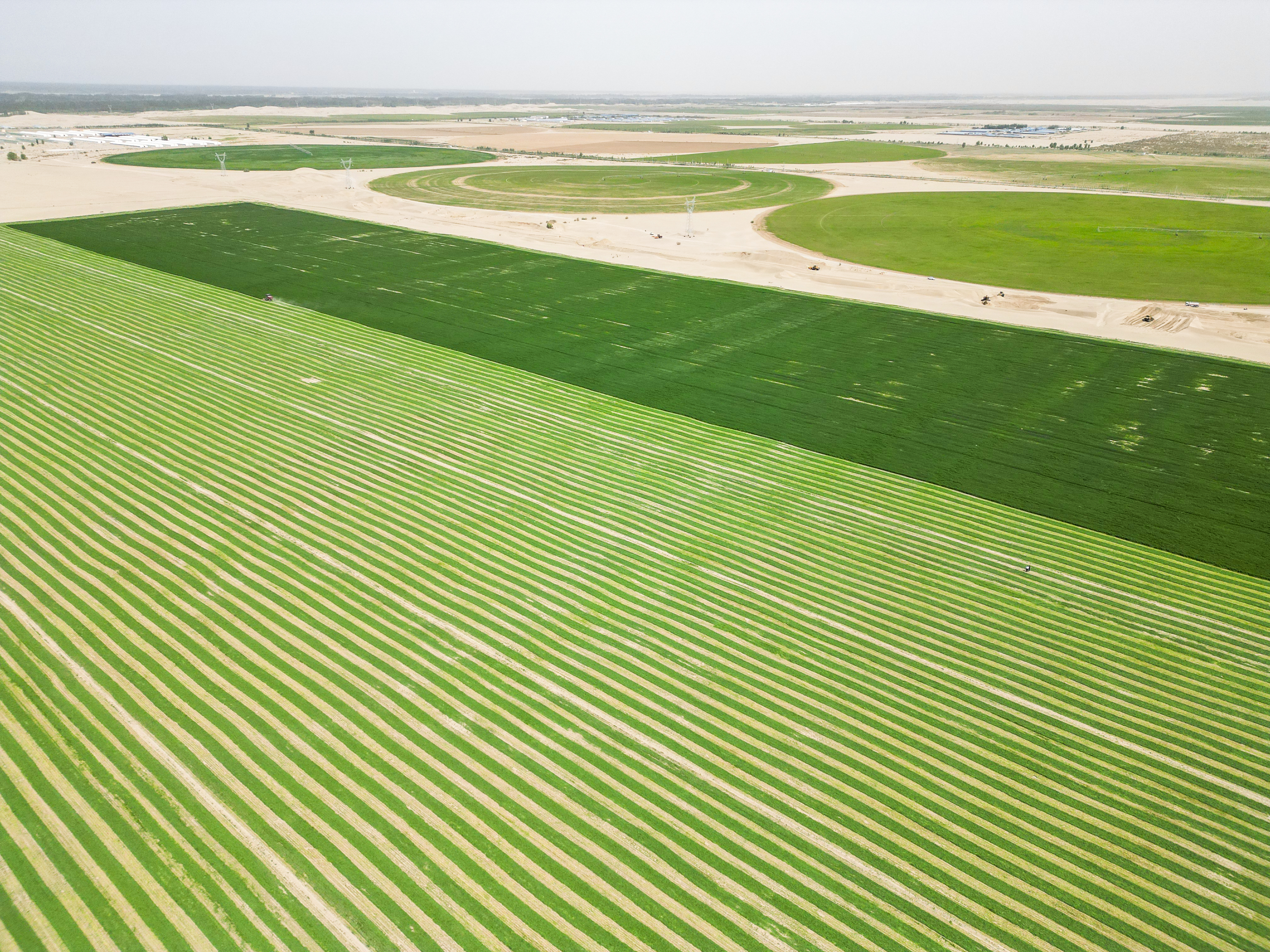 饲草料种植让黄沙变身“牧草银行”,为畜牧产业注入活力。在和田县,大型平移式喷灌机在智能控制下缓缓行进,为成片苜蓿补足水分,烈日下的绿苗与沙丘形成鲜明对比;策勒县的沙漠苜蓿与沙漠玉米连成绿色圆圈,将沙海染成“希望绿洲”。作为“牧草之王”,紫花苜蓿蛋白含量高、适口性好,能显著提升肉奶产量与品质。当地通过滴灌技术精准供水,培育出耐旱高产饲草品种,不仅为周边养殖场提供稳定饲料,秸秆还田更持续改善沙质土壤。