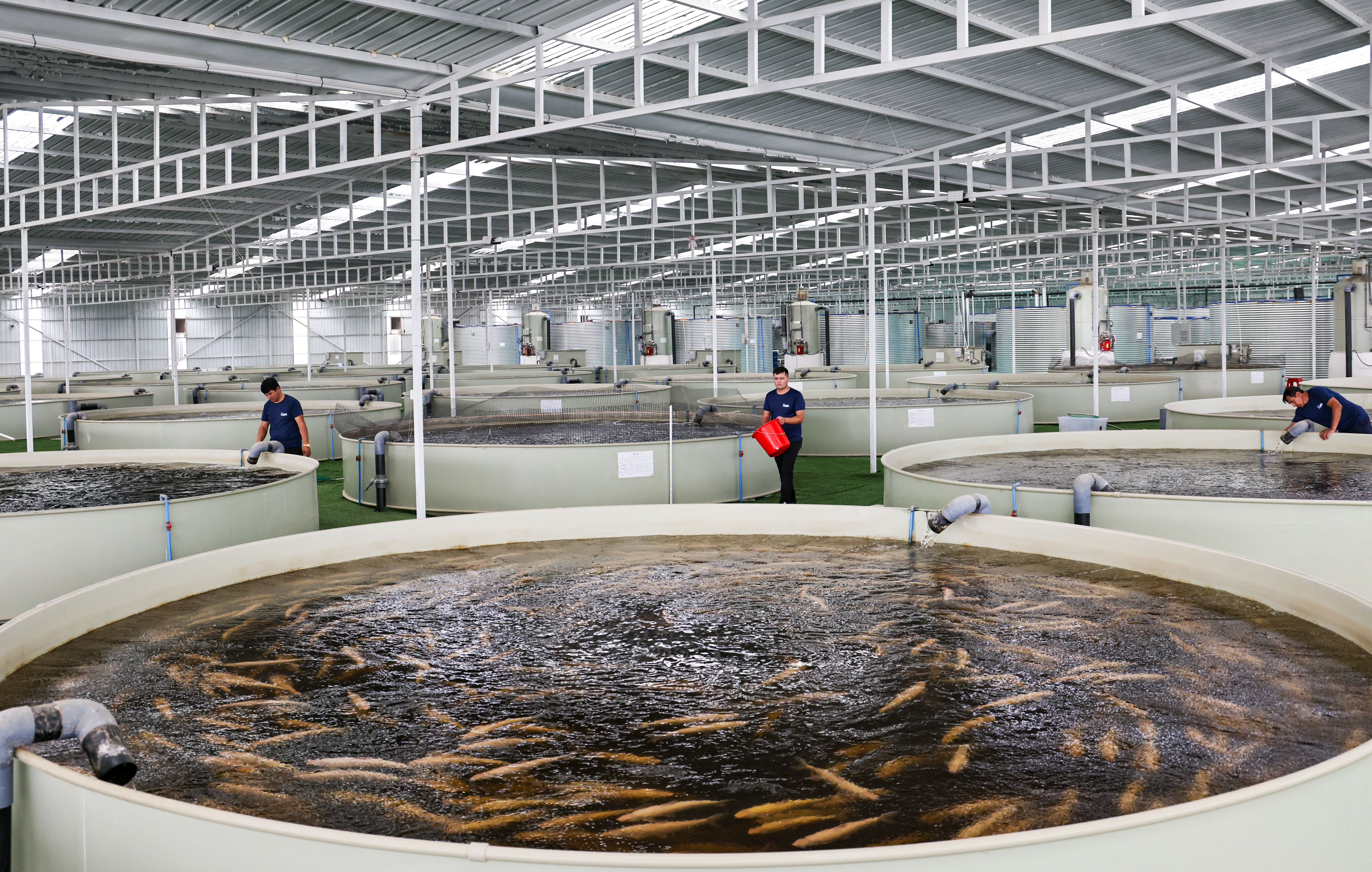 和田域见疆来水产养殖有限责任公司职工正在对养殖池进行日常管理。许晓龙 摄